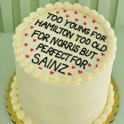 Pastel cubierto de Buttercream decorado en color blanco con frase personalizada.
